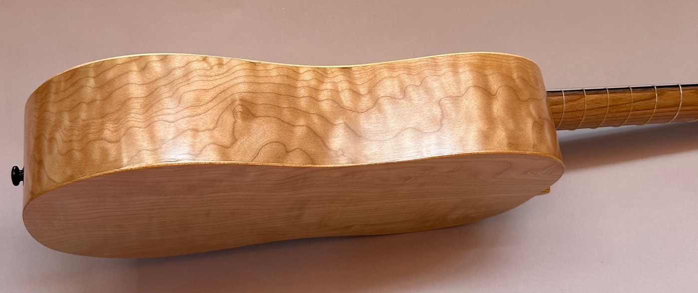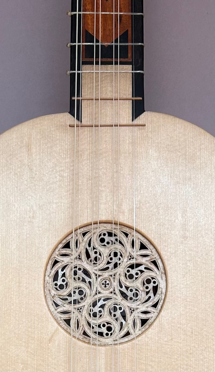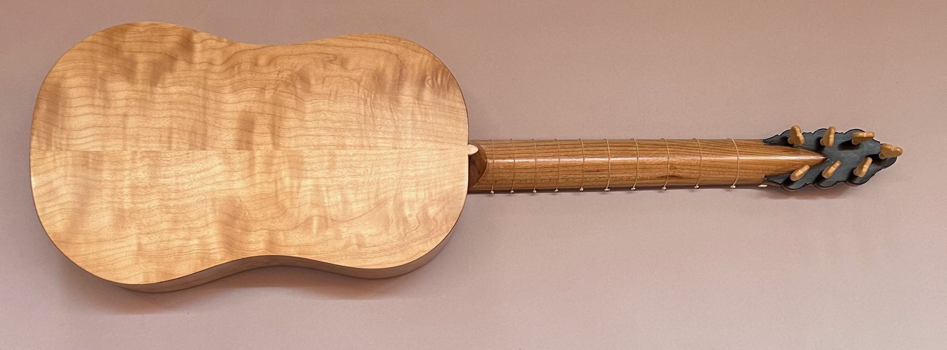 4 course Renaissance guitar in A at A-415 ( sounds fine at A-440 also) Carpathian bearclaw spruce top, gorgeous quilted maple back and sides, cherry neck, chevron design chakte viga and ebony fingerboard, pear bridge, boxwood heart pegs, in Nylgut, mensur 54 cm. With a good hard case. $2850.00