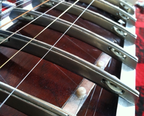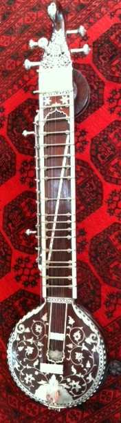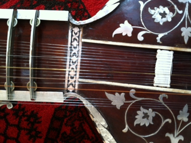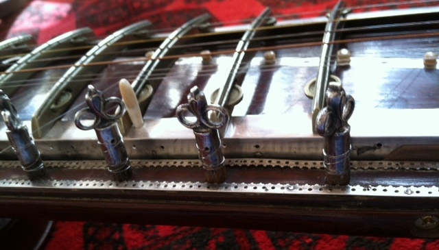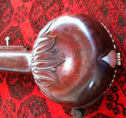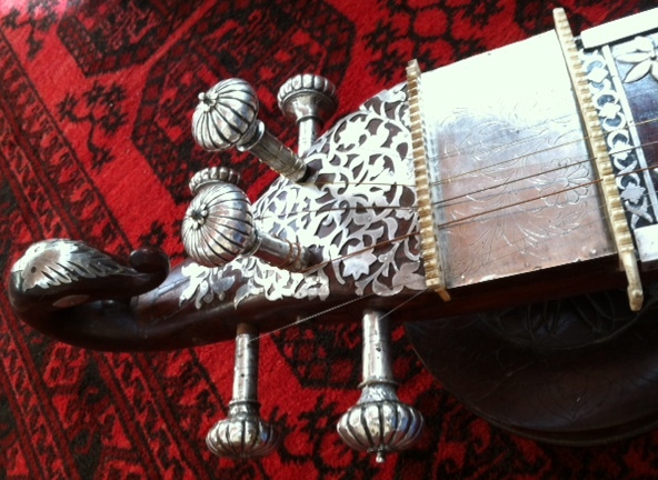 One of the finest instruments from India I have ever encountered. I had the honor and pleasure of restoring it to playability. This is an instrument that had been fantastically embellished with silver for a favored musician of a maharaja’s durbar. Entirely built of teak- the resonator was carved just like a natural gourd. The frets have a wheel-and-screw mechanism to set them on a silver ledge attached to the fingerboard- the only example like this I have seen. The pegs for the taraf strings are coiled double nagas. The upper tumba is constructed as a shallow box out of bent wooden strips and 2 turned plates. It is a massive instrument and would not have been easily played. This surbahar has a pride of place display at the Musical Instrument Museum, Phoenix, Arizona.