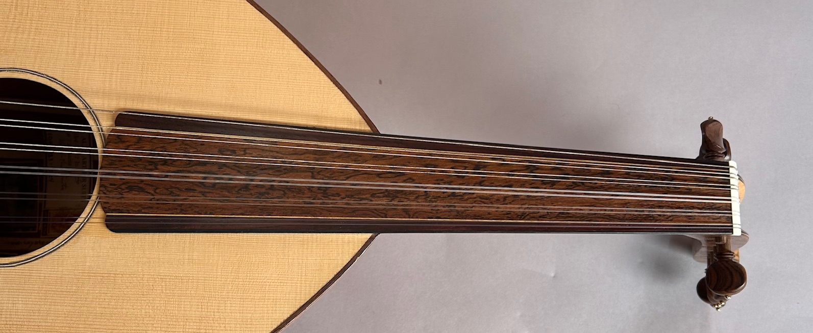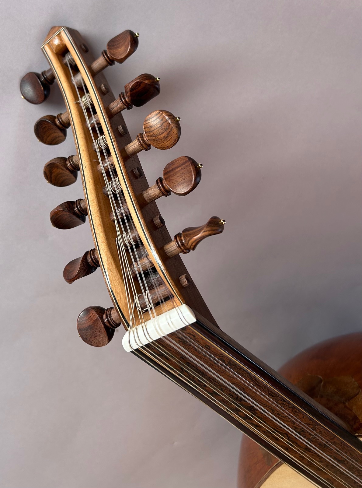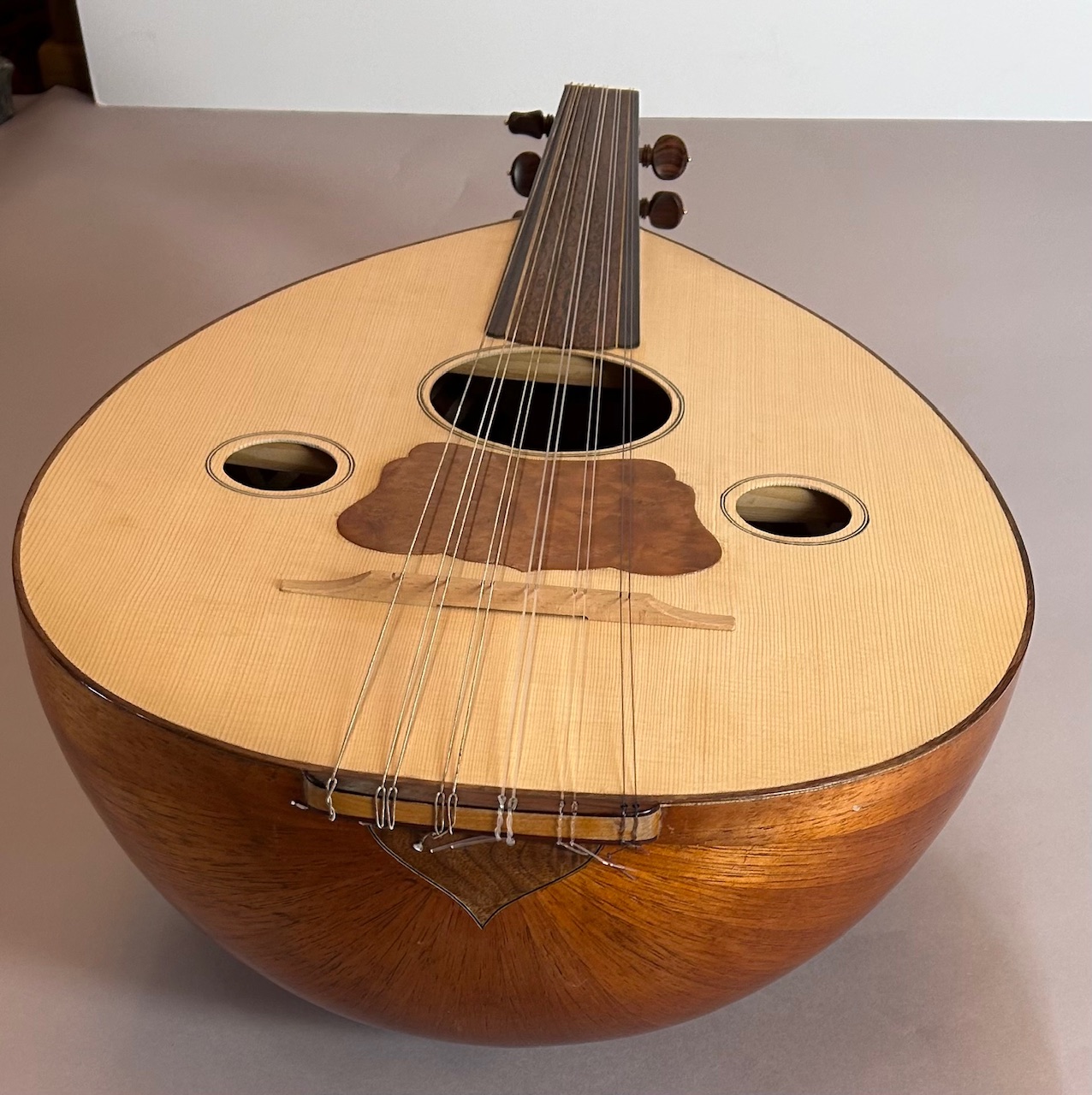 Iraqi or Bashir style floating bridge oud, 35+ year old Engelmann top, Spanish cedar bowl, walnut neck and walnut/beech pegbox, beautiful bocote and ebony fingerboard, rosewood pegs. $3500.00