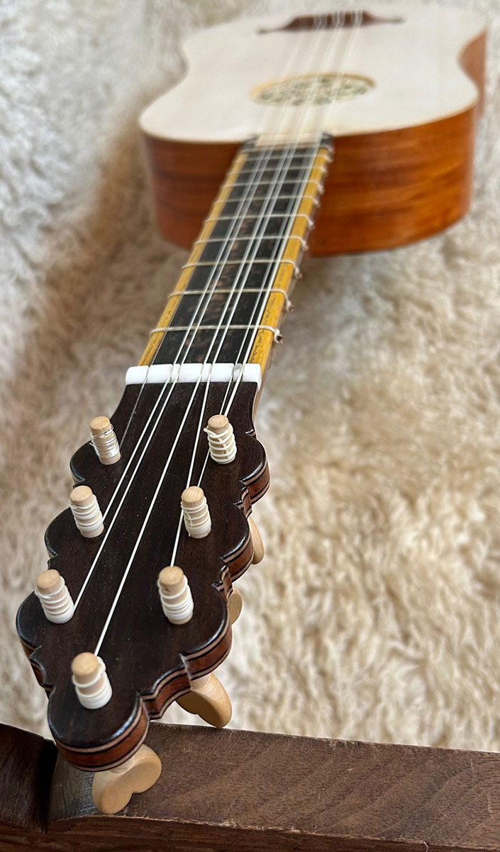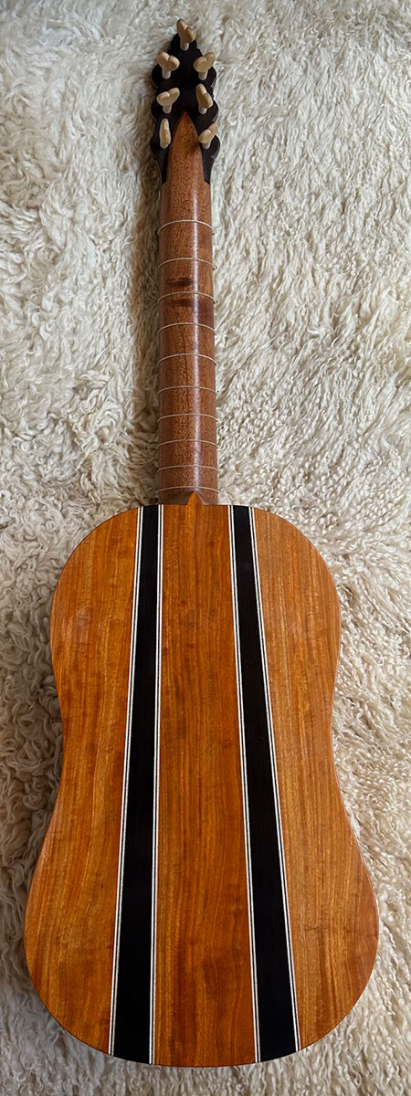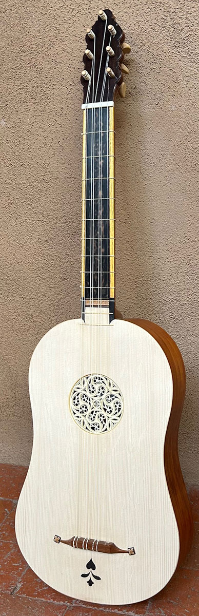 4 course Renaissance guitar in A at A-415, Carpathian bearclaw spruce top, Chakte Viga back/sides, 100 year old Cuban mahogany neck, ebony/osage orange fingerboard, pear bridge, boxwood heart pegs in Nylgut, mensur 54 cm. With a good hard case. $2950.00