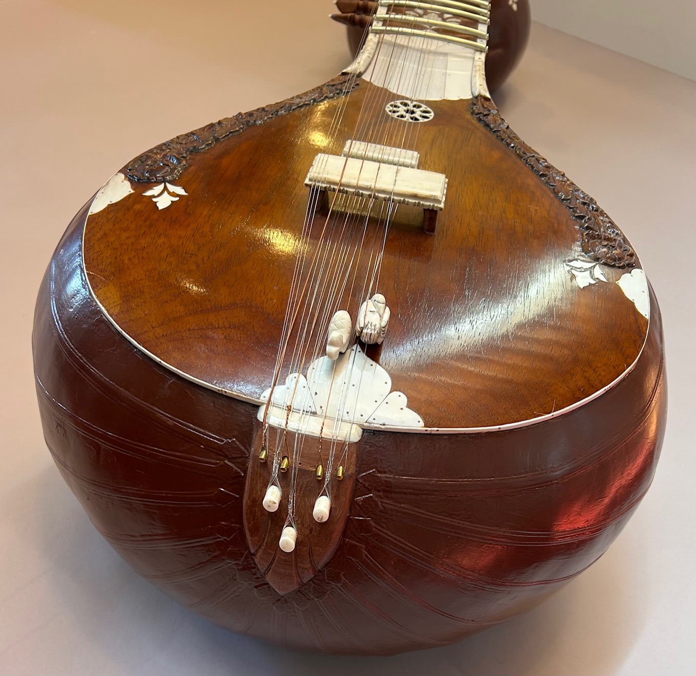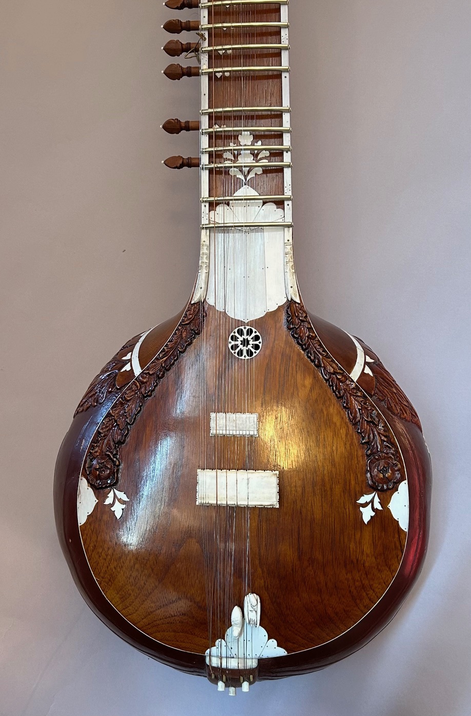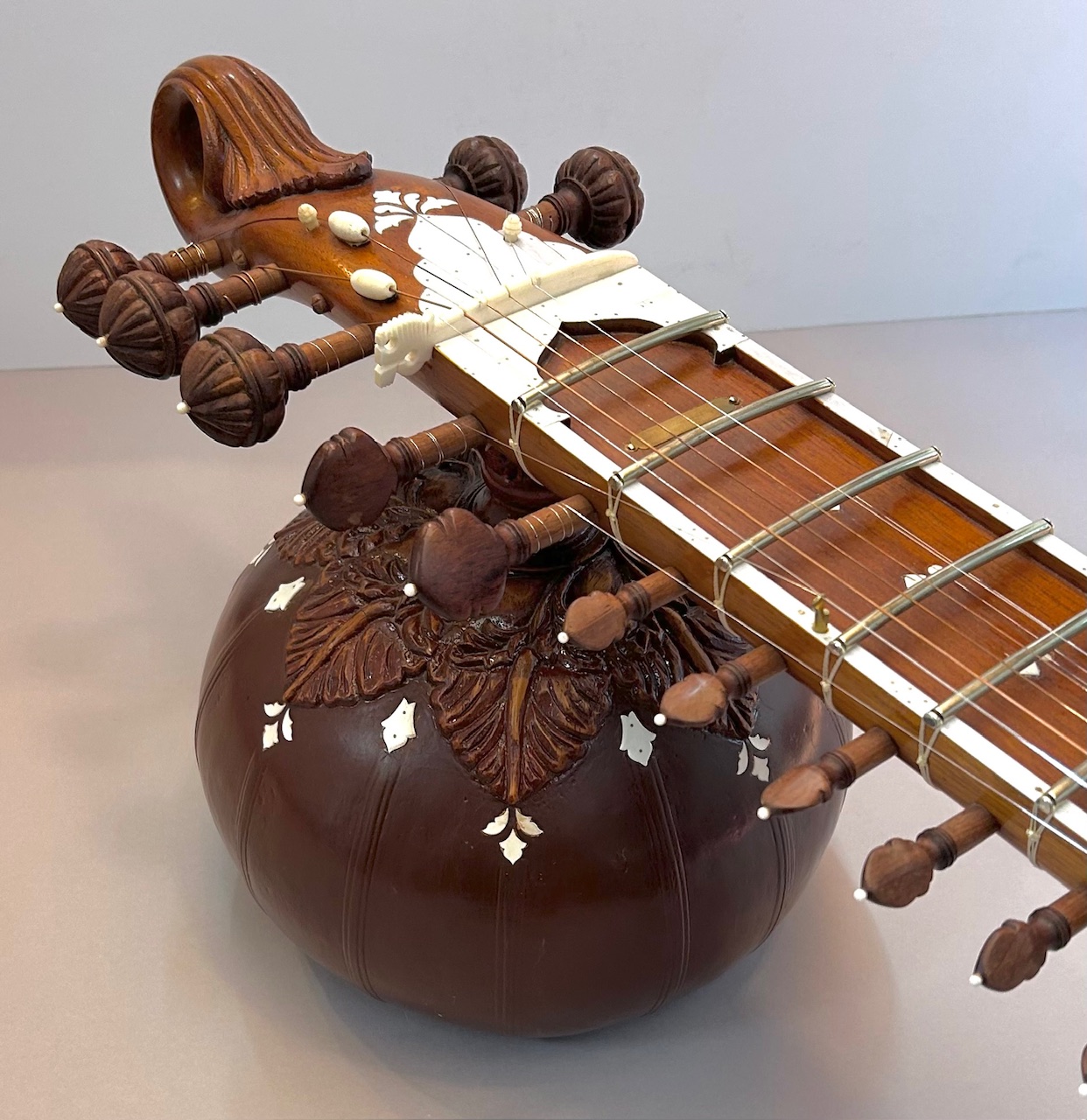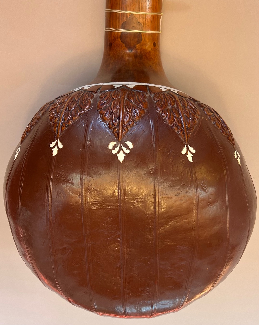 Sitar in the older “kachuwa” ( tortoise) style with a very broad large tabli, natural gourds, all Spanish cedar, sambar bridges, morado pegs, carved volute pegbox, all ivory ornaments from recycled 1940’s piano keys. I have used soundholes on my sitars as it increases the projection and overall tone noticeably. $8500.00