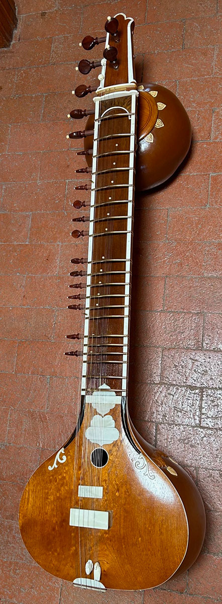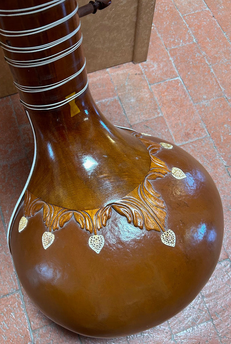 A sitar featuring many of my own design details. Mahogany neck and tabli, walnut fingerboard, camel bone bridges and ornaments, morado pegs, natural gourds. I do not use any plastic on my instruments. A soundhole as utilized here greatly improves projection and tone. My tailpiece design with individual pins for the string loops is a vast improvement on traditional construction. This is a superb sounding and playing sitar. $7900.00